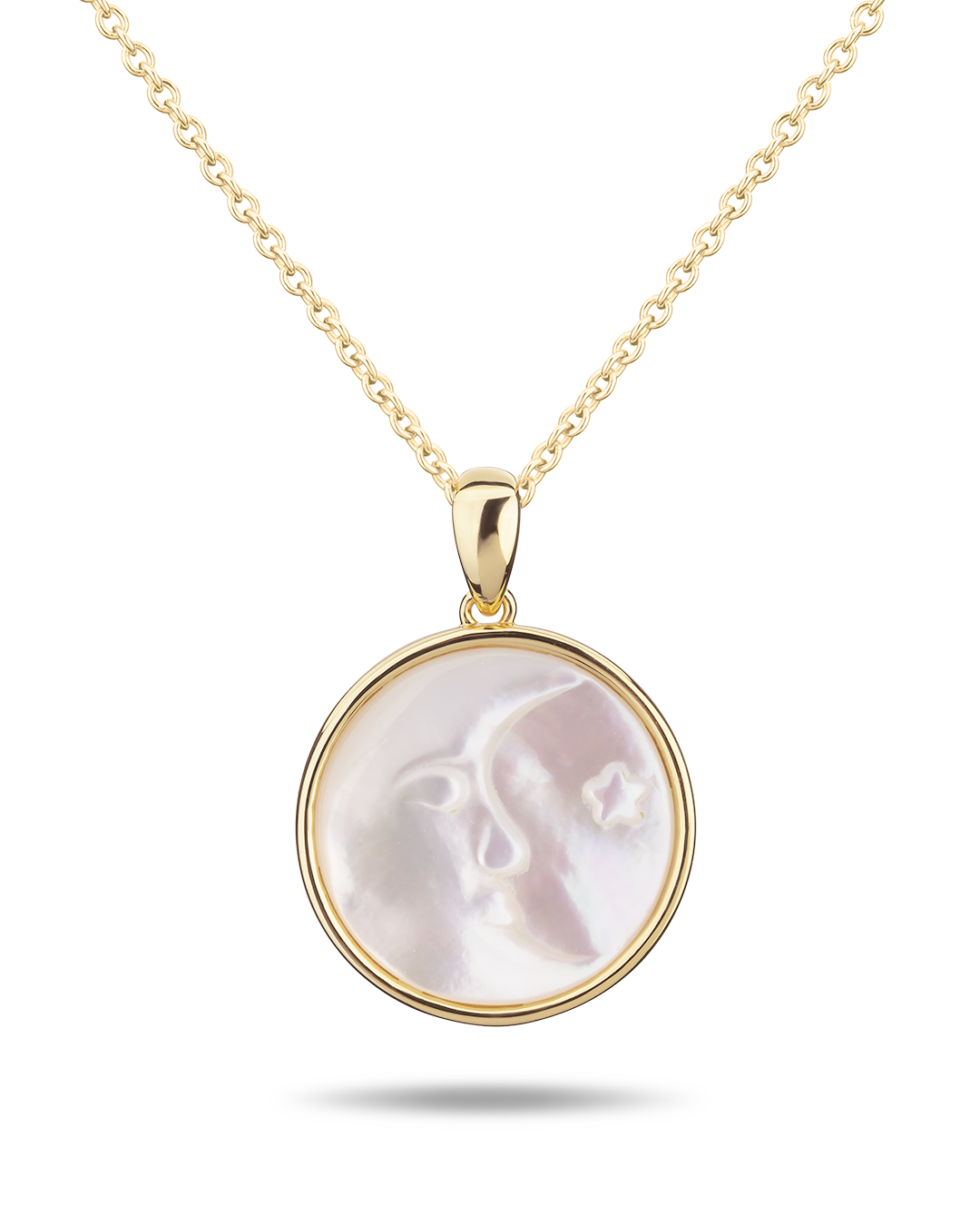 Překrásný náhrdelník Luminious Grace motivem měsíce a hvězdy v lesklém zlatém provedení je přesně ten kousek, který má v sobě magii – doslova. Jemně vyřezávaná lastura s tajemnou perleťovou kresbou hází odlesky jako noční obloha a působí elegantně, přesto lehce mystic vibes.
