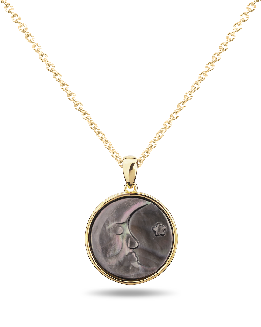 Překrásný náhrdelník Eternal Graces motivem měsíce a hvězdy v lesklém zlatém provedení je přesně ten kousek, který má v sobě magii – doslova. Jemně vyřezávaná lastura s tajemnou perleťovou kresbou hází odlesky jako noční obloha a působí elegantně, přesto lehce mystic vibes.